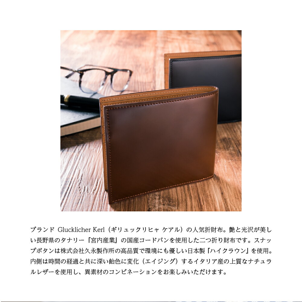 艶と光沢が美しい長野県のタナリー『宮内産業』の国産コードバンを使用した二つ折り財布で、スナップボタンは株式会社久永製作所の高品質で環境にも優しい日本製『ハイクラウン』を使用。